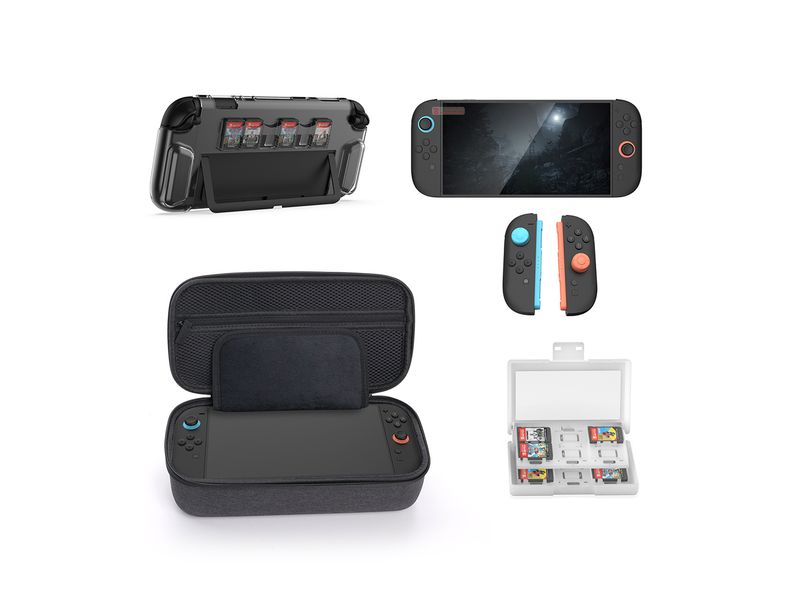 • Contenido del paquete. 10 diferentes accesorios, incluye: un estuche de transporte para Switch 2, una funda protectora transparente, 6 cubiertas para los analogos,1 protector de pantalla y un estuche individual de cartuchos.