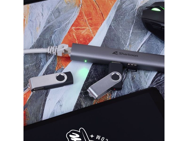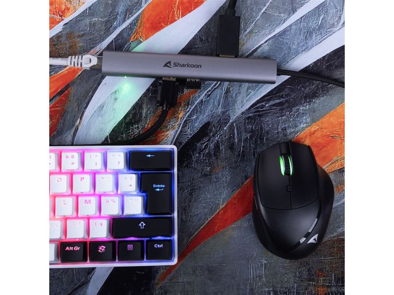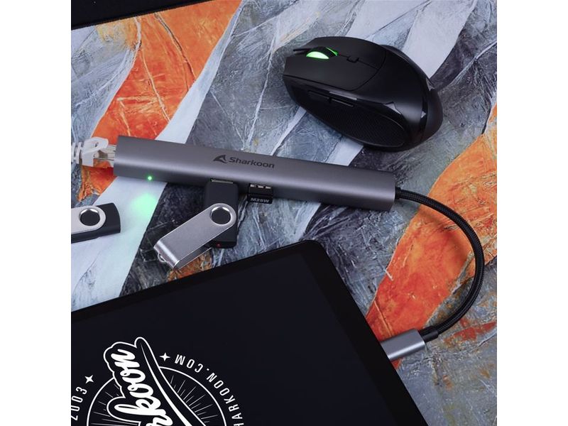 El Sharkoon OfficePal Combo es un adaptador multifuncional que transforma un puerto USB-C en múltiples conexiones esenciales.