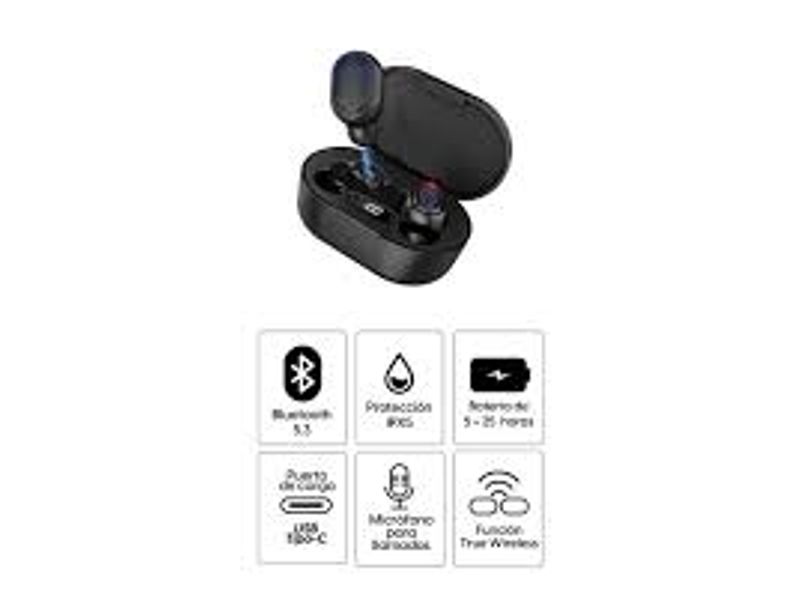 Audifono inalambrico bluetooth 5.3, marca 1HORA, modelo AUT 114 color negro, estuche de carga y transporte, conector C, pantalla indicadora y guia, alcance de 10 metros aproximadamente. tecnologia TWS, funcion por separado o en conunto, microfono para llamadas.
