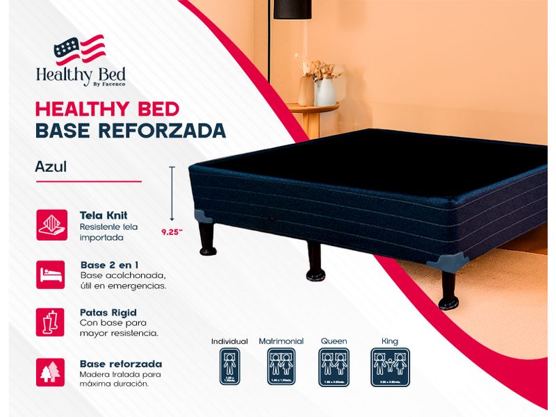 Dale a tu colchón el soporte que necesita con esta base fabricada en madera proveniente de bosques renovables. Su acabado en color azul aporta un estilo moderno y fresco, mientras que las patas plásticas garantizan estabilidad y resistencia. Ideal para colchones individuales, ofrece firmeza, durabilidad y un diseño que complementa cualquier habitación.