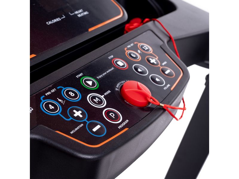 Funciones: Velocidad, inclinación, tiempo, distancia, calorías, pulso, gráfico, sueño. Con botón rápido para Velocidad.