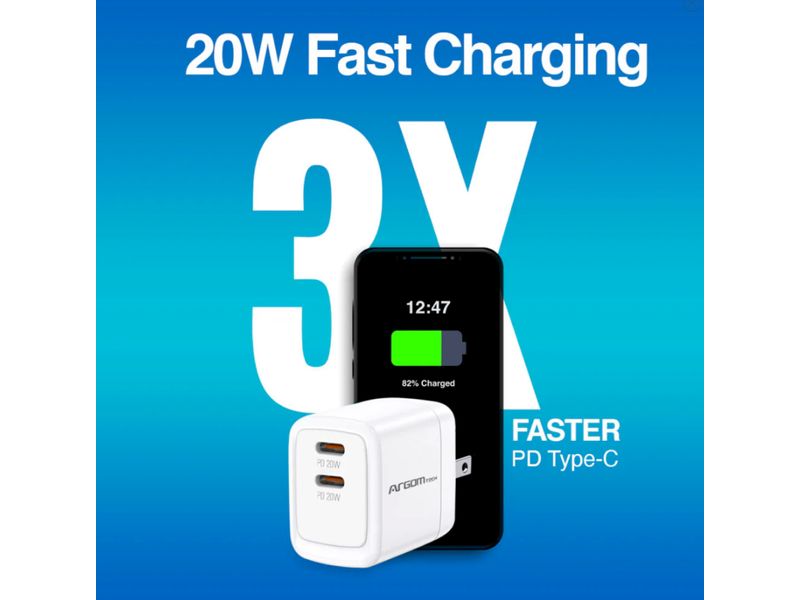 Cargue con confianza con el cargador rápido de pared PD de 40 W de ArgomTech, diseñado con dos puertos USB-C que ofrecen un total de 40 W (20 W cada uno si se usan simultáneamente). Al usar un solo puerto, disfrute de hasta 35 W de carga rápida y eficiente, ideal para smartphones, tablets e incluso portátiles pequeños. Compacto y ligero, este cargador es perfecto para viajes o para el uso diario y se conecta a cualquier tomacorriente de pared estándar de EE. UU. Las funciones de seguridad integradas protegen sus dispositivos contra sobrecorriente, sobretensión y cortocircuitos, garantizando una carga segura y confiable en todo momento.