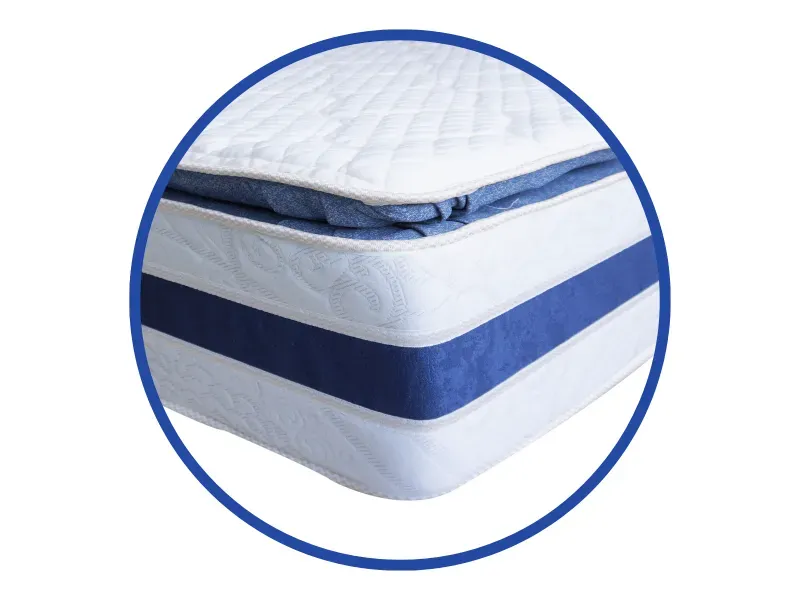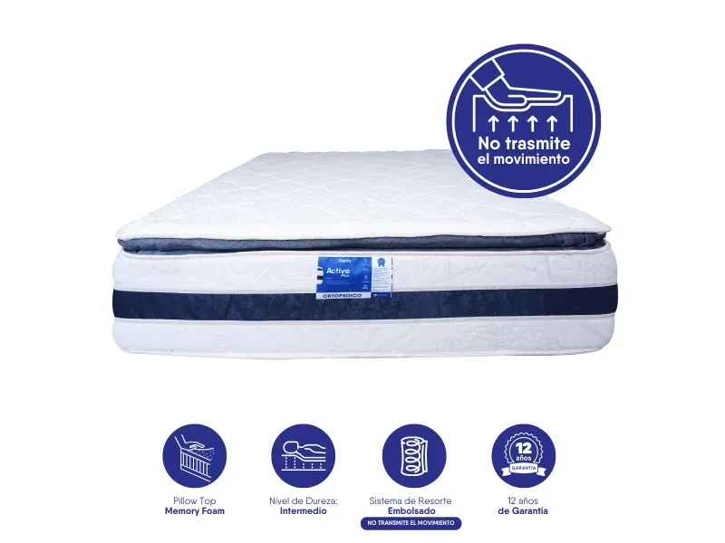 Colchón de resorte embolsado convencional que no trasmite movimiento, con base de Foam de alta densidad. Pillow Top en Foam hiperventilado, telas antialérgicas y antiácaros. Sistema no vuelta, un Pillow Top de un lado. Ortopédico. Grosor 15 pulgadas, soporta 110 kilos por persona. Tamaño individual 100x190