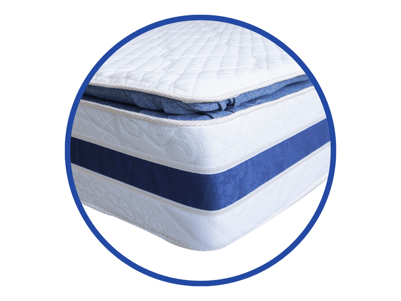 Colchón de resorte embolsado convencional que no trasmite movimiento, con base de Foam de alta densidad. Pillow Top en Foam hiperventilado, telas antialérgicas y antiácaros. Sistema no vuelta, un Pillow Top de un lado. Ortopédico. Grosor 15 pulgadas, soporta 110 kilos por persona. Tamaño matrimonial 140x190