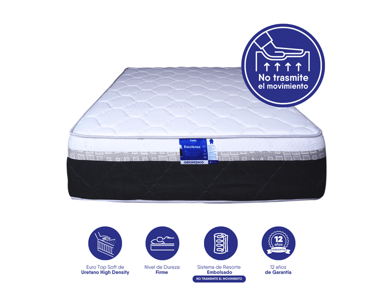 Colchón de resorte embolsado convencional que no trasmite movimiento, con base extra firme de Foam Tela anti alérgicas y antiácaros. Sistema no vuelta, con un Euro Top de un lado. Ortopédico. Grosor 14 pulgadas, soporta 120 kilos por persona. Tamaño individual 100x190
