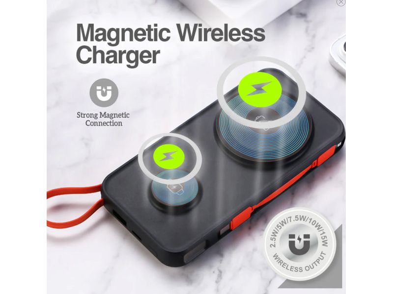 La estación de carga magnética 4 en 1 de 10 000 mAh ST10 es una solución de carga todo en uno tan versátil como potente. Con una batería de polímero de litio de 10 000 mAh y carga inalámbrica magnética de 15 W, esta batería externa está diseñada para cargar varios dispositivos simultáneamente, incluyendo auriculares inalámbricos, relojes inteligentes y teléfonos. Su cable tipo C integrado y el cable adicional Lightning/tipo C garantizan la compatibilidad con una amplia gama de dispositivos, lo que la convierte en una solución de carga verdaderamente universal. Su diseño delgado y portátil, junto con la pantalla LCD de la batería, le aportan mayor comodidad, facilitando el acceso a los niveles de carga y optimizando su portabilidad.
