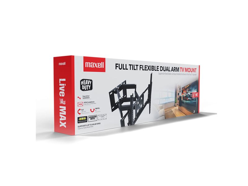 El soporte Maxell modelo STV-90 es ideal para instalar televisores de 32 a 90 pulgadas de manera segura y funcional. Su diseño full tilt flexible con brazos duales permite inclinar, extender y ajustar la posición de la pantalla para obtener el mejor ángulo de visión desde cualquier punto de la habitación. Fabricado con materiales de alta resistencia, brinda una sujeción firme y duradera, garantizando estabilidad incluso con televisores de gran tamaño. Es fácil de instalar y compatible con la mayoría de marcas, convirtiéndose en una excelente opción para salas amplias, oficinas o espacios donde se requiere versatilidad y robustez.