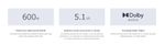 Al combinar la barra de sonido, el subwoofer y los parlantes posteriores inalámbricos, se logra una increíble experiencia de audio y un sonido Surround dinámico que llena por completo la sala. Además, gracias a sus 600 W de salida y a la tecnología Dolby Digital®, disfrutarás de un sonido potente que te sumergirá por completo en la acción.