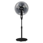 Acabado del ventilador color negro, Aspas ABS, Diametro de Aspas 16", tipo de parrilla metálica, oscilante si, control remoto No, Control de tiempo No, consumo total 70w, fácil de armar, turbo, enchufe polarizado y con fusible.